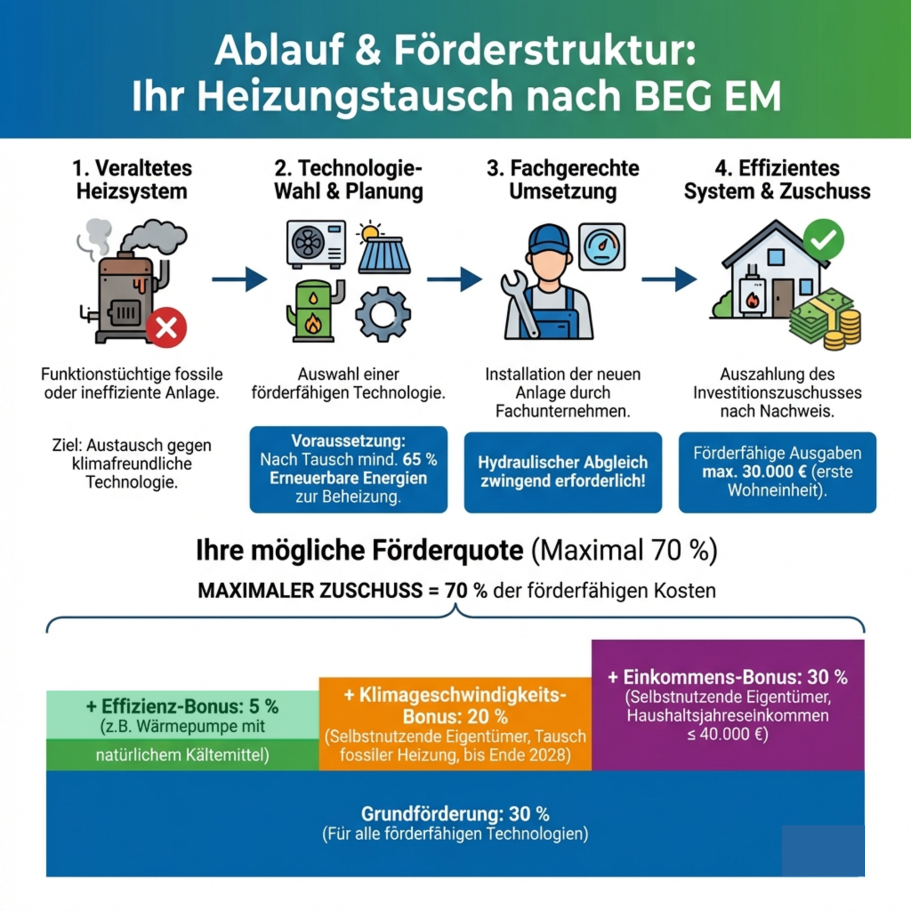 - Klimageschwindigkeits-Bonus: +20 % für selbstnutzende Eigentümer beim Austausch funktionstüchtiger fossiler Heizungen (befristet bis Ende 2028).